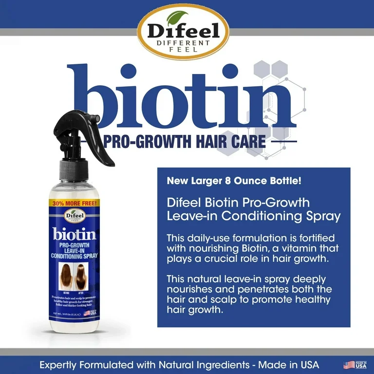 بخاخ ديفيل بيوتين برو-جروث ليف ان كونديشينينغ (Difeel Biotin Pro-Growth Leave-In Conditioning Spray) بحجم 177 مل هو بخاخ بلسم يُترك على الشعر، مصمم للمساعدة في تعزيز نمو الشعر الصحي وجعله يبدو أقوى وأكثر كثافة.