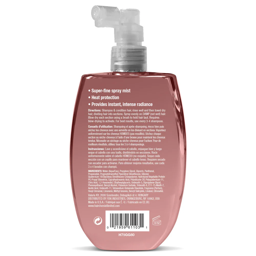 رذاذ خفيف الوزن للغاية يمنح لمعانًا فوريًا وحماية للشعر. يساعد على تنعيم الشعر المتطاير وفك التشابك ويخلق لمسة نهائية عاكسة كالزجاج لمظهر أنيق. تم تزويده بحماية من الحرارة لحماية الشعر من أضرار أدوات التصفيف الحرارية وحبس اللمعان والنعومة الحريرية.