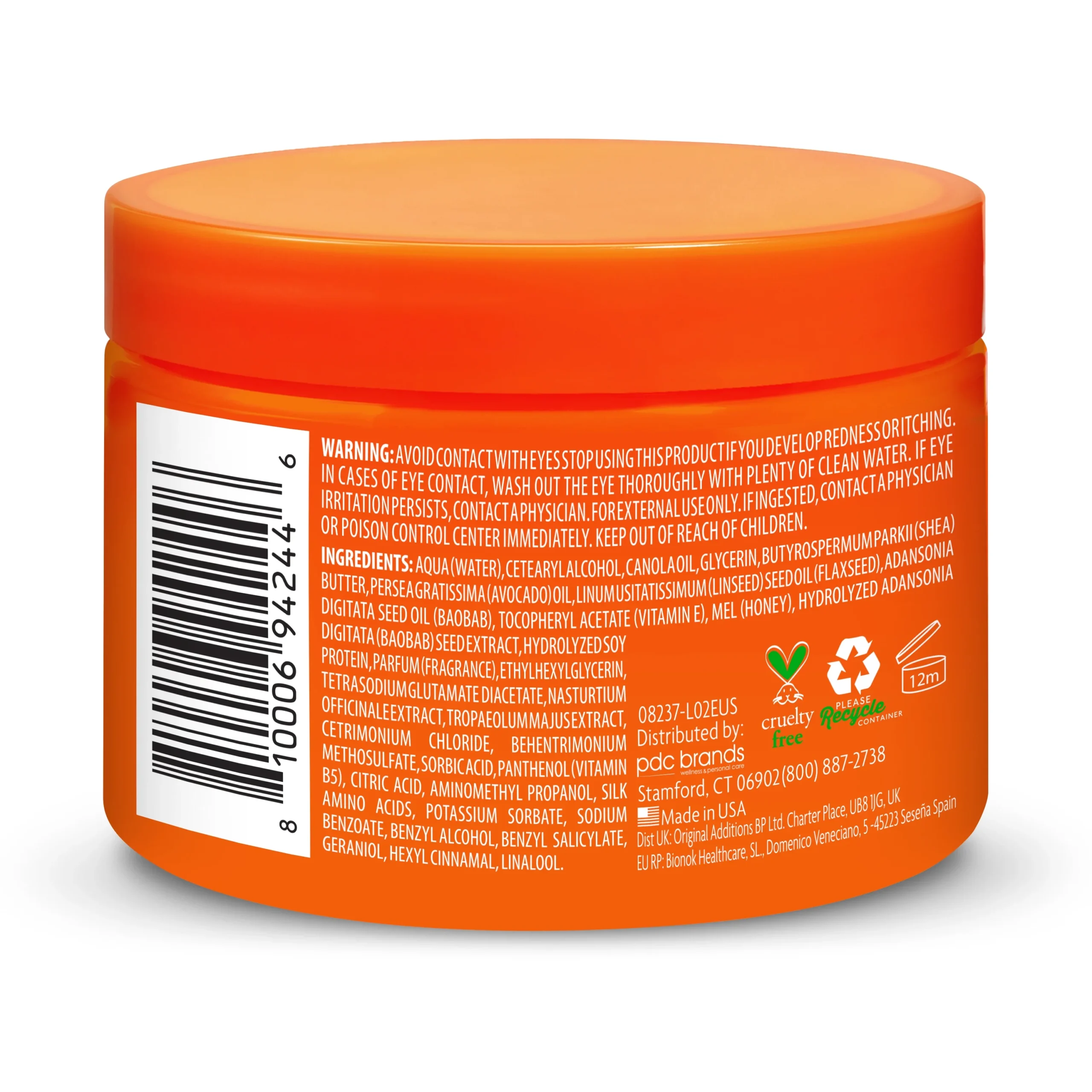 Ingredients: WATER (AQUA, EAU), CETEARYL ALCOHOL, CANOLA OIL, GLYCERIN, BUTYROSPERMUM PARKII (SHEA) BUTTER, PERSEA GRATISSIMA (AVOCADO) OIL, LINUM USITATISSIMUM (LINSEED) SEED OIL, ADANSONIA DIGITATA SEED OIL (BAOBAB), TOCOPHERYL ACETATE (VITAMIN E), HONEY (MEL, MIEL), HYDROLYZED ADANSONIA DIGITATA SEED EXTRACT, HYDROLYZED SOY PROTEIN, FRAGRANCE (PARFUM), ETHYLHEXYLGLYCERIN, BENZYL ALCOHOL, TETRASODIUM GLUTAMATE DIACETATE, NASTURTIUM OFFICINALE EXTRACT, TROPAEOLUM MAJUS EXTRACT, CETRIMONIUM CHLORIDE, BEHENTRIMONIUM METHOSULFATE, SORBIC ACID, PANTHENOL, CITRIC ACID, AMINOMETHYL PROPANOL, SILK AMINO ACIDS.