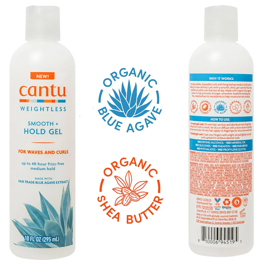 جل Cantu Weightless Smooth + Hold Gel (295 مل / 10 أونصة سائلة) هو منتج مخصص لتصفيف الشعر المموج والمجعد، يوفر ثباتاً متوسطاً وتحكماً في التطاير دون ترك ملمس قاسي.